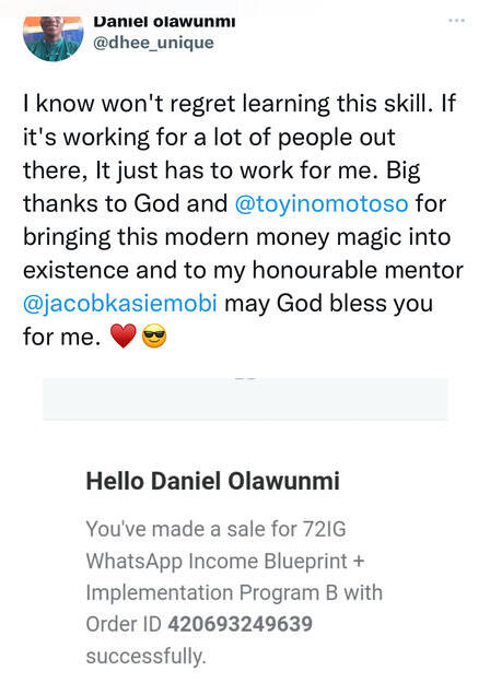 With this, you can even design a page for your current business.✅ You are getting a done for you WhatsApp Income campaign for 3 hot selling products on Expertnaire to help you start making money as fast as possible.✅ You are getting (FOR FREE) Toyin Omotoso's Twitter Money Blueprint which gives you tons of free organic traffic to your WhatsApp. (Toyin is selling this for N25,000)✅ If you already use Facebook to sell your products, You shall be learning what to do if Facebook bans your account.✅ And you will also be getting access to a 3-hour weekly online support class where we will also be helping you tackle any of the challenges you might have. (Value - Priceless)